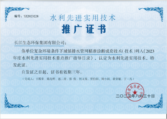 近日,公司申報的“復雜環境條件下城鎮排水管網精準診斷成套技術”成功入選《2023年水利先進實用技術重點推廣指導目錄》,為公司技術首次入選該目錄。