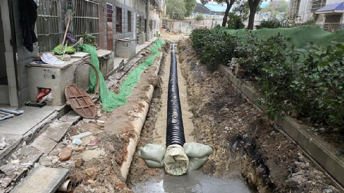 ▲ 東風(fēng)湖流域正在進(jìn)行污水管道安裝的天潤(rùn)化工小區(qū)。攝影:朱靜霞
