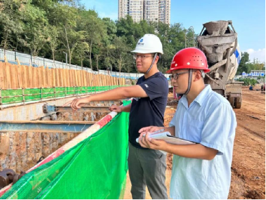 在江西九江,兩湖(南門湖、甘棠湖)綜合治理項目現場,項目經理王寒冬正與施工單位網格員檢查湖邊箱涵重建工作。