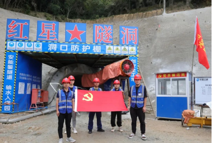 黨員同志們在紅星隧道建設現場與黨旗合影