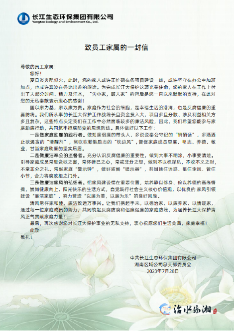 國以家為基,家以廉為貴。家庭作為社會的細胞,是幸福生活的港灣,也是反腐倡廉的重要防線。黨總支將《致員工家屬的一封信》送達至每位員工家屬手中,堅持開展家庭助廉行動。