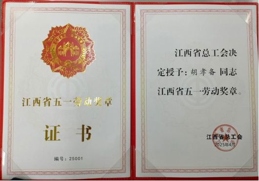 2025年5月16日,江西省總工會授予胡孝備“江西省五一勞動獎章”